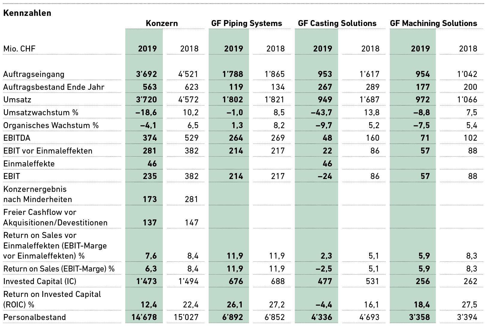 Die Performance von GF Casting Solutions war 2019 vor allem durch den strukturellen Wandel und durch Marktturbulenzen in der europäischen Automobilindustrie geprägt. Um die Wettbewerbsfähigkeit in diesem neuen Umfeld sicherzustellen, hat die Division zügig umfassende strukturelle und operative Massnahmen umgesetzt. Die Devestition der Eisengiesserei in Herzogenburg (Österreich) mit negativen Einmalkosten von CHF 9 Mio. und die teilweise Verlagerung des Standorts Werdohl (Deutschland) mit Kosten in der Höhe von CHF 37 Mio. führten im Jahr 2019 zu einmaligen Gesamtkosten von CHF 46 Mio.
